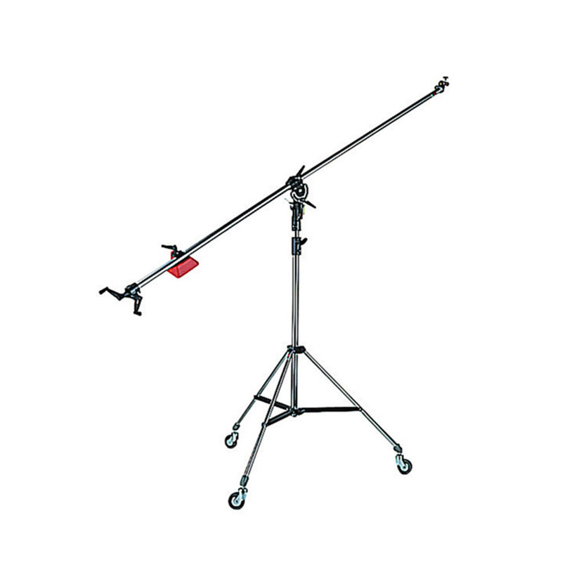 Manfrotto 025BS. Super Boom στήριξης φωτιστικών με μηχανική ρύθμιση της κεφαλής που περιλαμβάνει τον βραχίονα, αντίβαρο 7 κιλών, τρίποδο Cine με ρόδες και κλιπς καλωδίων. Μήκος βραχίονα 270 εκ. αντοχή φορτίου σε πλήρη επέκταση 5 κιλά.